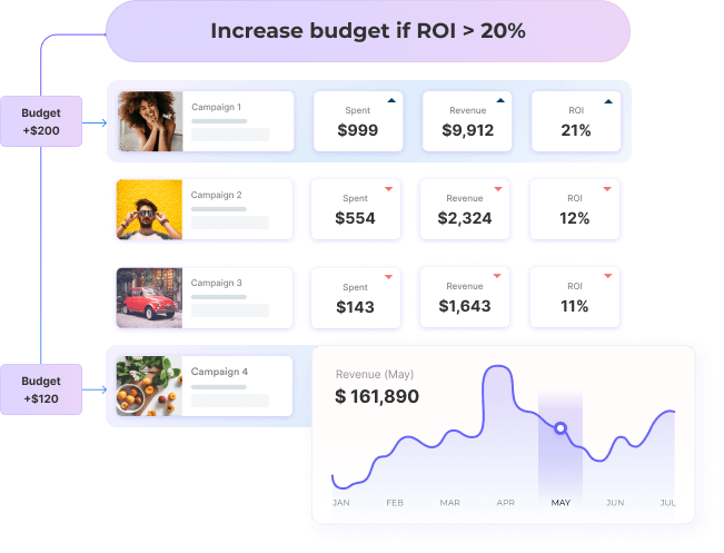 Create custom rules on campaign, ad, or publisher site level. Scale bids and budgets on profitable entities, block publishers that are delivering non-converting traffic, and pause ads with low CTRs, all on auto-pilot.